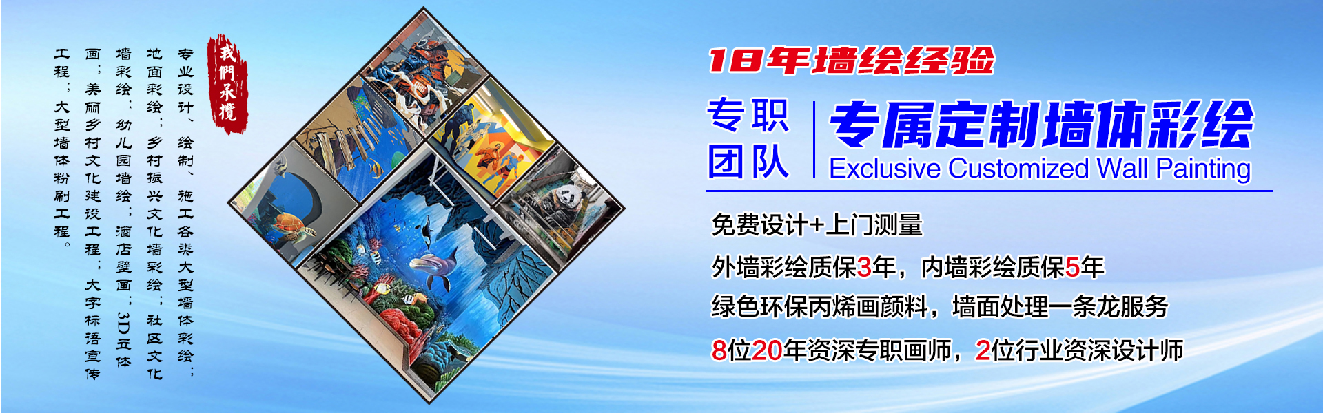 業(yè)務范圍涵蓋:社區(qū)文化建設彩繪;校園文化建設彩繪;各類文化墻彩繪;古建彩繪;家居彩繪;幼兒園墻繪;酒店壁畫;3D立體畫;文化街美化工程的建設;美麗鄉(xiāng)村文化建設工程;房地產圍擋樓盤展示工程;大字標語宣傳工程;浮雕雕塑、門樓牌樓、噴泉假山等工藝美術施工工程;各種大型墻體粉刷工程。
